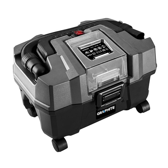Aku. (bežični) usisivač za radionice i automobile GRAPHITE 58GE105 sa kapacitetom od 10 L je uređaj koji radi sa baterijama Graphite Energy+ od 2 Ah ili 4 Ah. Dizajniran je i za mokri i suvi rad a poseduje i funkciju duvaljke. Lako se transportuje zahvaljujući širokoj ručki na izvlačenje i četiri transportna točkića. Dolazi sa fleksibilnim crevom dužine 2m , HEPA filterom, vodootpornim sunđerastim filterom, dva radna nastavka i fleksibilnim adapterom. Uređaj dolazi bez baterije.