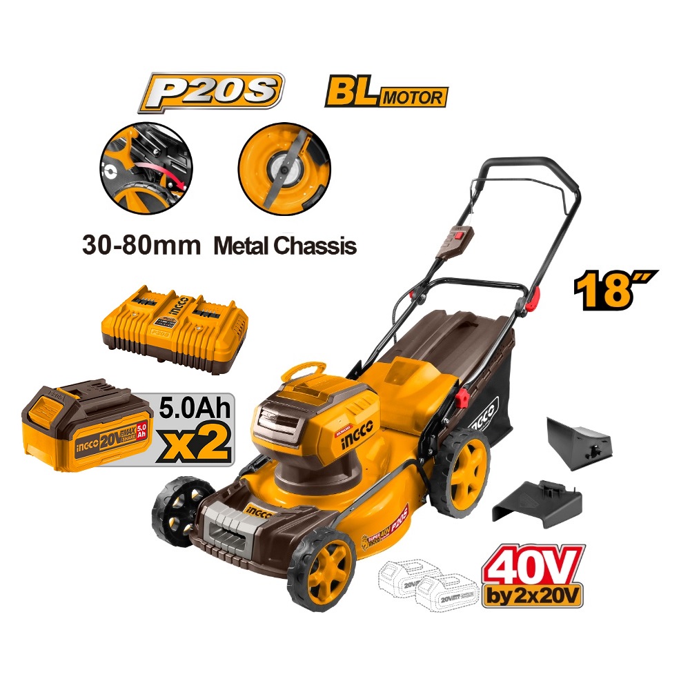 Napaja se kombinacijom dve 20V baterije (40V ukupno), što omogućava snažan rad bez potrebe za kablom. Ergonomičan sistem upravljanja, lagano telo i dizajn sa četiri točka obezbeđuju udobno manevrisanje bez umora tokom celodnevnog rada.