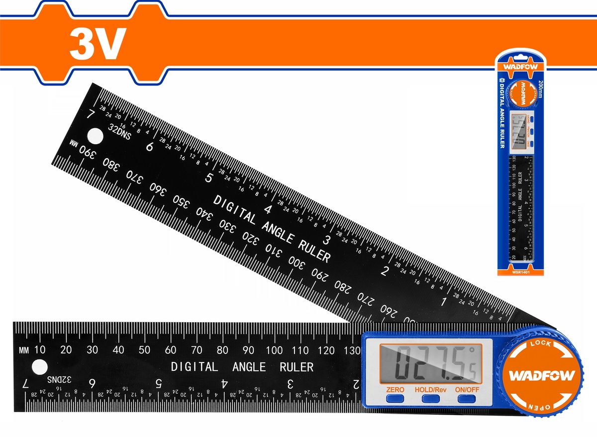 WADFOW WSR1401 digitalni uglomer dizajniran je za precizna merenja u građevinarstvu, mašinstvu, stolariji i tehničkim radovima. Omogućava merenje uglova u opsegu od 0 do 360°, kao i merenje dužina do 200 mm i 400 mm (pri 180°), što ga čini izuzetno fleksibilnim alatom za različite primene.