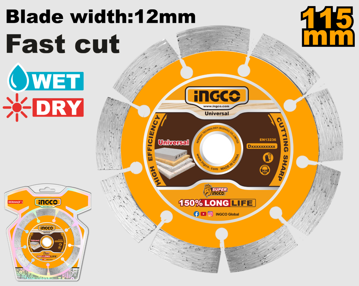 INGCO DMD0111513 dijamantski rezni disk odlikuje odličan odnos cene i kvaliteta, zahvaljujući snažnom dijamantskom segmentu koji omogućava produžen radni vek i visoku preciznost. Pogodan je za obe vrste sečenja — suvo i mokro — što ga čini univerzalnim izborom za građevinske, tehničke i zanatske radove.