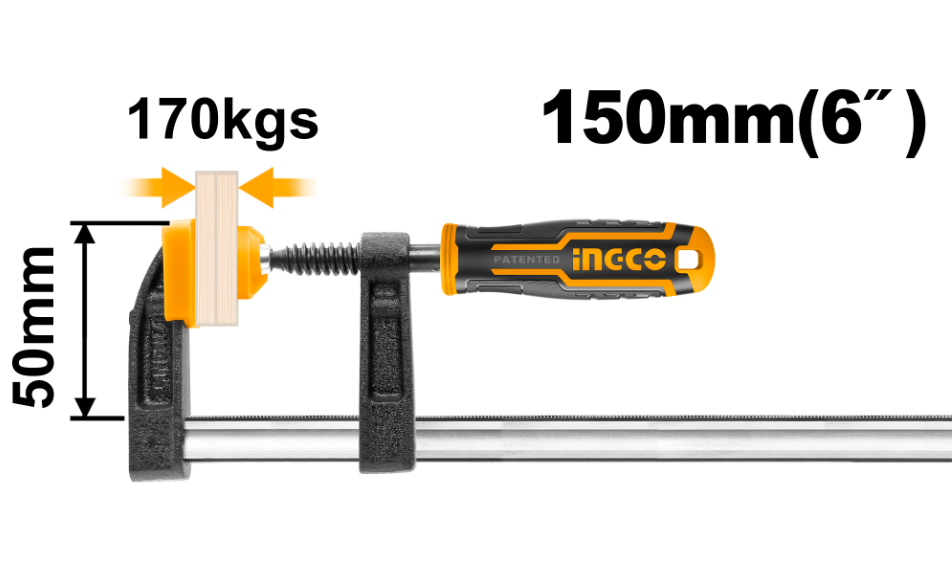 INGCO HFC020501 F stega dimenzija 50×150 mm, sa snagom stezanja od 170 kg, čeličnim klizačem 5×15 mm i navojnim vretenom prečnika 11 mm, obezbeđuje snažno i precizno fiksiranje materijala.