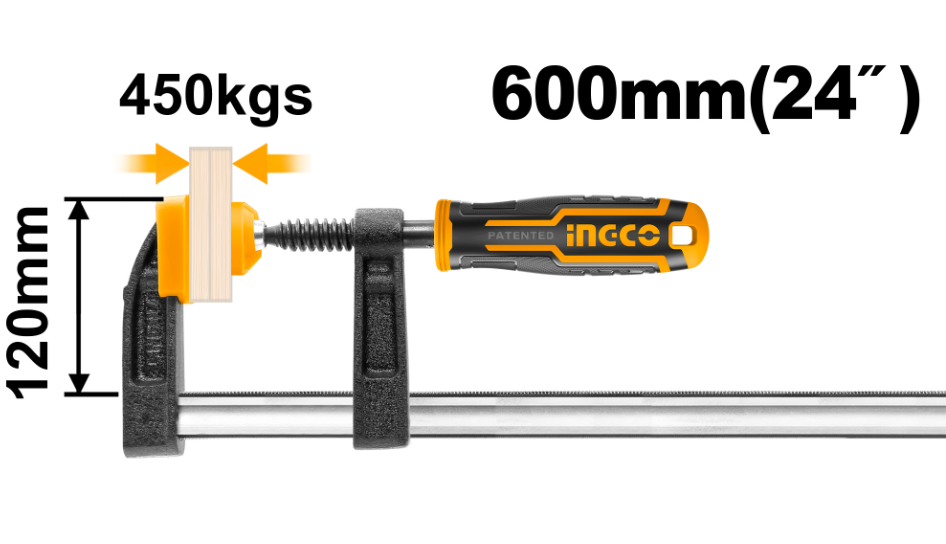 INGCO HFC021205 F-stega 120 × 600 mm Industrial obezbeđuje snažnu silu stezanja od 450 KGS uz robustan čelični klizač 8 × 30 mm i vreteno prečnika 15.3 mm, idealna za zahtevne profesionalne radove.