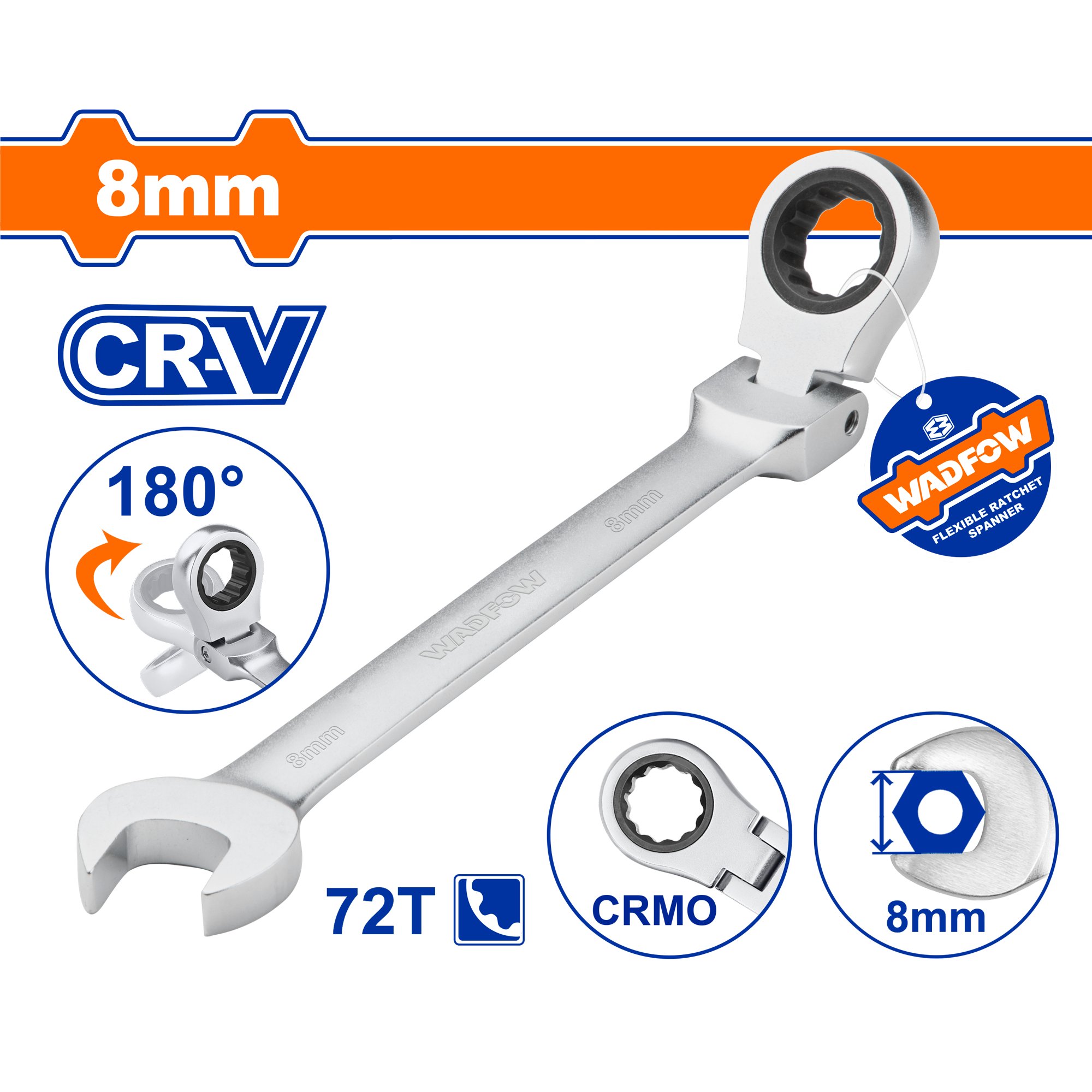 WADFOW WSA6108 vilasti ključ izrađen je od visokokvalitetnog Cr-V čelika, dok je glava izrađena od CrMo materijala, što obezbeđuje izuzetnu čvrstoću i dugotrajnost. Fleksibilna glava sa mogućnošću okretanja do 180° omogućava rad u teško dostupnim prostorima i olakšava manipulaciju alatom.