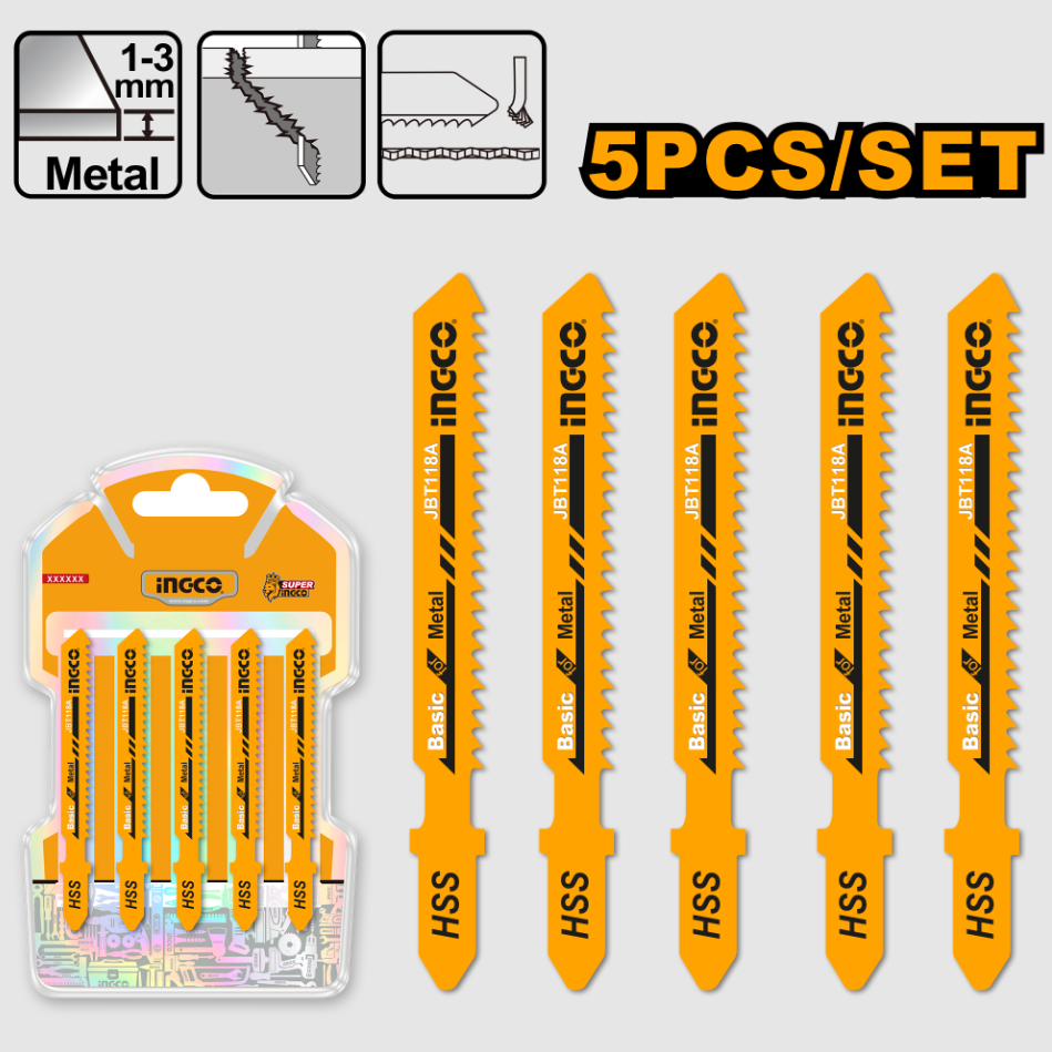 Listovi ubodne testere INGCO JBT118A za metal, dužine 50 mm, 21 TPI, izrađeni od HSS čelika, u setu od 5 komada.