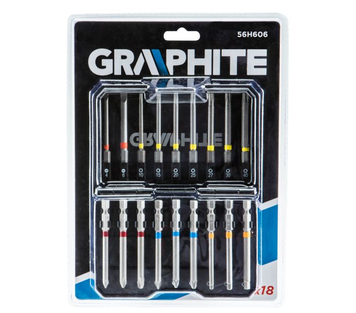 Set od 18 kom. specijalno produženih bitova GRAPHITE 56H606 za montažne radove sa duboko skrivenim zavrtnjima – savršeni za montažu nameštaja. Set uključuje biteve: SL4, SL6, TX10, TX15, TX20, TX25, TX27, TX30, TX40, PH1, PH2, PH3, PZ1, PZ2, PZ3, H3, H4 i H5.