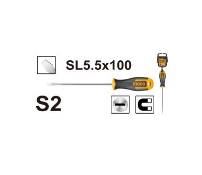 INGCO HS685100 ravni odvijač izrađen je od visokokvalitetnog S2 čelika, što ga čini otpornim na habanje i dugotrajnim za svakodnevnu upotrebu. Sa prečnikom od 5.5 mm i dužinom od 100 mm, ovaj odvijač je odličan izbor za montažne, servisne i tehničke radove gde je potrebna preciznost.