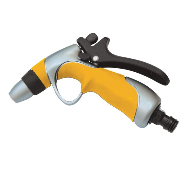 Pištoljska prskalica ima podesivi izlaz vode: od tvrdog mlaza do fine magle. Potpuno podesiv protok. Mlaznica i drška prekrivene ne klizajućim slojem. Praktično zaključavanje okidača. Izdržljivo i lagano aluminijumsko kućište.