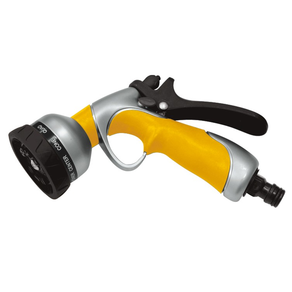 Pištoljska prskalica sa multifunkcionalnom mlaznicom sa 10 uzoraka: ravna, ugaona, ventilator, tuš, mlaznica, konus, kvadrat, puna, magla, šejker. Potpuno podesiv protok. Mlaznica i drška prekrivene ne klizajućim slojem. Praktično zaključavanje okidača. Izdržljivo i lagano aluminijumsko kućište.