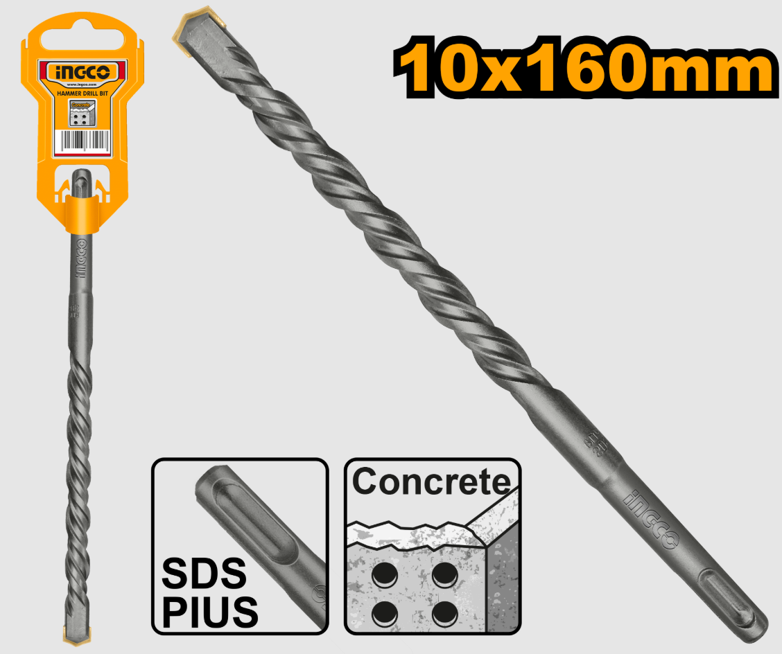 SDS+ burgija za beton INGCO DBH1211002 10×160mm omogućava brzo i precizno bušenje betona i tvrdih materijala zahvaljujući kvalitetnoj izradi i stabilnom SDS+ prihvatu.