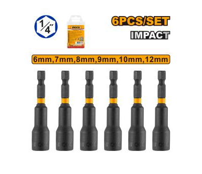 Set AMN65061 sadrži šest kvalitetnih magnetnih bitova brenda INGCO, dimenzija 6 mm, 7 mm, 8 mm, 9 mm, 10 mm i 12 mm. Svi bitovi imaju dršku veličine 1/4″ HEX, dužinu približno 65 mm, i napravljeni su od čelika tipa 50BV30, što obezbeđuje visoku čvrstoću i otpornost na habanje. Posebno su opremljeni snažnim magnetnim vrhom koji omogućava čvrst prihvat vijaka i olakšava rad — smanjuje klizanje i ubrzava proces šrafljenja.