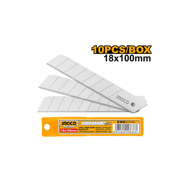 Set INGCO HKNSB112 sadrži 10 komada kvalitetnih zamenskih nožića za skalpel koji su pogodni za modele alata sa sečivima širine 18 mm. Dimenzije svakog nožića su približno 18 mm širine × 100 mm dužine, sa debljinom od oko 0,5 mm, što omogućava precizno i čisto sečenje kartona, folije, plastike i sličnih materijala.