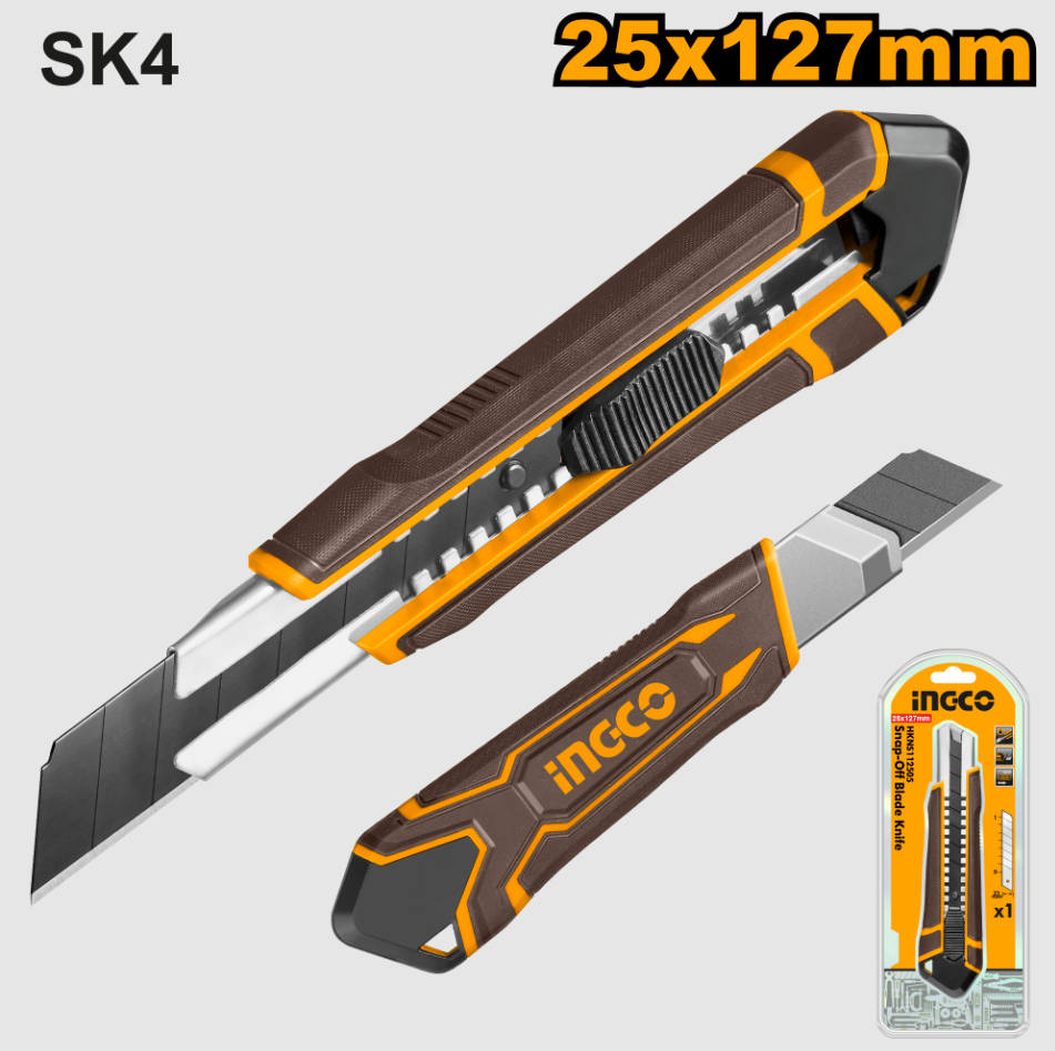 Ovaj Ingco skalpel HKNS112505 dizajniran je za korisnike koji zahtevaju sigurnost, kontrolu i oštrinu u radu. Opremljen je automatskim zaključavanjem koje sprečava pomeranje oštrice tokom upotrebe.